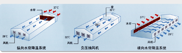 濕簾降溫系統:水流在水泵的作用下通過噴淋管道進入波紋狀的纖維紙表面,從而形成水簾,當室外干熱空氣在風機的作用下穿過水簾時,空氣中的熱量將被流動的水流帶走蒸發,從而達到降溫的目的。